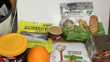 Boîtes, des produits sous-vide, agrumes, saucissons, marmelade d’orange pour le petit-dej…et beaucoup de sachets lyophilisés : Pascal a prévu 36 kg de vivres pour son voyage. A moins d’une semaine de l’arrivée, il lui reste encore quelques fruits frais : citrons verts et kiwis. Et encore 30 litres d’eau, sur les 80 litres embarqués au départ.